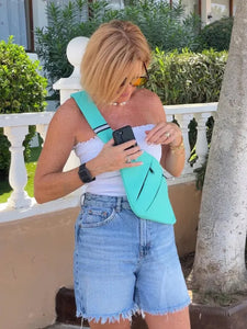 Es muy compacto, pero sorprende con lo que cabe dentro: puedes llevar tu celular, Kindle o tablet pequeña, powerbank, audífonos, lentes, billetera, llaves y hasta un cuaderno o pasaporte. Todo organizado y siempre a mano, sin sentir que cargas algo voluminoso.